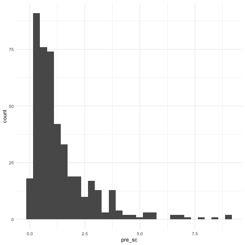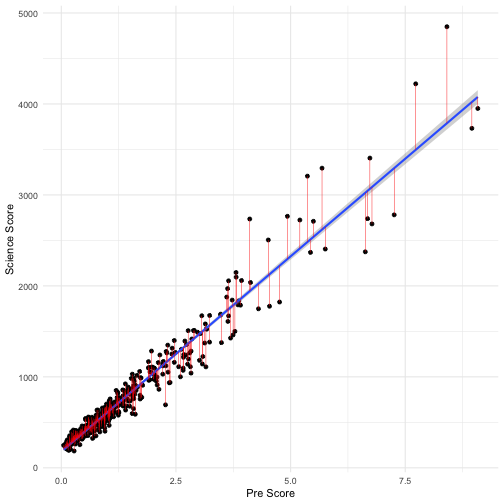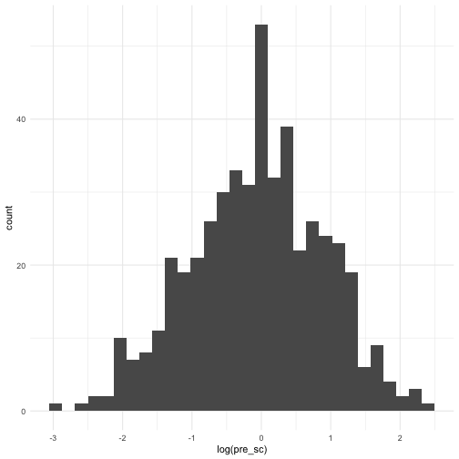 ] .date[ ### 29 January 2025, last update: 2025-02-05 ] --- # Let's set the stage * Last week we talked about the assumptions that go into linear modeling. * We didn't talk about what happens when these assumptions are violated. This week we'll discuss * Data transformations * Missing data Both of these are real issues that arise all the time in doing regression analyses. --- class: center, middle # Let's start where we ended last week Start by getting the data into R ``` r #This loads the csv and saves it as a dataframe titled week_1_data sci_df <- read_csv(here("data", "science_scores2.csv")) ``` --- # Let's remember last week ### We want to predict a science score from a math score. ``` r *Mod1 <- lm(sci ~ math_sc, data = sci_df) summary(Mod1) ``` ``` ## ## Call: ## lm(formula = sci ~ math_sc, data = sci_df) ## ## Residuals: ## Min 1Q Median 3Q Max ## -1046.2 -362.0 -140.4 144.3 4657.9 ## ## Coefficients: ## Estimate Std. Error t value Pr(>|t|) ## (Intercept) -279.474 167.378 -1.670 0.0957 . ## math_sc 15.967 2.478 6.445 3.15e-10 *** ## --- ## Signif. codes: 0 '***' 0.001 '**' 0.01 '*' 0.05 '.' 0.1 ' ' 1 ## ## Residual standard error: 612.7 on 424 degrees of freedom ## (74 observations deleted due to missingness) ## Multiple R-squared: 0.08922, Adjusted R-squared: 0.08707 ## F-statistic: 41.53 on 1 and 424 DF, p-value: 3.154e-10 ``` Note - we have a new dataset! --- # Let's check some other variables ## What about pre score? ``` r Mod2 <- lm(sci ~ pre_sc, data = sci_df) summary(Mod2) ``` ``` ## ## Call: ## lm(formula = sci ~ pre_sc, data = sci_df) ## ## Residuals: ## Min 1Q Median 3Q Max ## -649.40 -50.95 8.69 50.72 1061.37 ## ## Coefficients: ## Estimate Std. Error t value Pr(>|t|) ## (Intercept) 178.935 9.786 18.29 <2e-16 *** ## pre_sc 429.168 4.872 88.08 <2e-16 *** ## --- ## Signif. codes: 0 '***' 0.001 '**' 0.01 '*' 0.05 '.' 0.1 ' ' 1 ## ## Residual standard error: 147.2 on 450 degrees of freedom ## (48 observations deleted due to missingness) ## Multiple R-squared: 0.9452, Adjusted R-squared: 0.9451 ## F-statistic: 7759 on 1 and 450 DF, p-value: < 2.2e-16 ``` --- # Let's check on the assumptions ### Normality of Residuals Residuals are distributed normally. ### Linearity Predictor and Fitted are linearly related ### Homogeneity of varicance The standard deviation of the residual is the same at all values of the Outcome ### Uncorrelated predictors The correlations between predictor variables is small (We'll come back to this) ### No bad outliers There aren't any individual data points that are really impacting our model --- # Let's start with a scatter plot <!-- --> That doesn't look good, doesn't look like the residuals are normally distributed --- # Let's check the normality We can do a histogram of residuals .pull-left[ <!-- --> ] .pull-right[ ``` r Mod2_df %>% ggplot(aes(y = .resid)) + geom_histogram() + theme_minimal() + coord_flip() ``` ] definitely not normal distribution... --- # Let's check the normality Also doesn't hurt to check the pre_score itself .pull-left[ <!-- --> ] .pull-right[ ``` r Mod2_df %>% ggplot(aes(y = pre_sc)) + geom_histogram() + theme_minimal() + coord_flip() ``` ] definitely not normal distribution... Now What???? --- # Let's transform our data ## When your data are not normally distributed, you can apply a transformation. The most common transformation is a log transformation .pull-left[ <!-- --> ] .pull-right[ ``` r sci_df %>% ggplot(aes(y = log(pre_sc))) + geom_histogram() + theme_minimal() + coord_flip() ``` ] --- # Let's use the log transform in a model ``` r Mod3 <- lm(sci ~ log(pre_sc), data = sci_df) summary(Mod3) ``` ``` ## ## Call: ## lm(formula = sci ~ log(pre_sc), data = sci_df) ## ## Residuals: ## Min 1Q Median 3Q Max ## -571.75 -212.78 -102.83 95.64 2887.15 ## ## Coefficients: ## Estimate Std. Error t value Pr(>|t|) ## (Intercept) 826.35 17.44 47.40 <2e-16 *** ## log(pre_sc) 533.34 18.28 29.18 <2e-16 *** ## --- ## Signif. codes: 0 '***' 0.001 '**' 0.01 '*' 0.05 '.' 0.1 ' ' 1 ## ## Residual standard error: 369.6 on 450 degrees of freedom ## (48 observations deleted due to missingness) ## Multiple R-squared: 0.6542, Adjusted R-squared: 0.6534 ## F-statistic: 851.2 on 1 and 450 DF, p-value: < 2.2e-16 ``` --- # Let's interpret this new model ``` r summary(Mod3) ``` ``` ## ## Call: ## lm(formula = sci ~ log(pre_sc), data = sci_df) ## ## Residuals: ## Min 1Q Median 3Q Max ## -571.75 -212.78 -102.83 95.64 2887.15 ## ## Coefficients: ## Estimate Std. Error t value Pr(>|t|) ## (Intercept) 826.35 17.44 47.40 <2e-16 *** ## log(pre_sc) 533.34 18.28 29.18 <2e-16 *** ## --- ## Signif. codes: 0 '***' 0.001 '**' 0.01 '*' 0.05 '.' 0.1 ' ' 1 ## ## Residual standard error: 369.6 on 450 degrees of freedom ## (48 observations deleted due to missingness) ## Multiple R-squared: 0.6542, Adjusted R-squared: 0.6534 ## F-statistic: 851.2 on 1 and 450 DF, p-value: < 2.2e-16 ``` --- # Let's check the normality We can do a histogram of residuals for transformed data .pull-left[ <!-- --> ] .pull-right[ ``` r log_Mod3_df %>% ggplot(aes(y = .resid)) + geom_histogram() + theme_minimal() + coord_flip() ``` ] --- # Let's evaluate this new model Is this model with the transformed data better? * The `\(R^2\)` is lower in the new model * The residuals aren't normally distributed. So maybe this data transformation was not the right way to go. There are other approaches to data transformation. --- # Let's consider another transform ## Another common transformation is to use Z-scores This makes it easy to compare coefficients across models and between different variables. ``` r Mod4 <- lm(scale(sci) ~ scale(math_sc), data = sci_df) summary(Mod4) ``` ``` ## ## Call: ## lm(formula = scale(sci) ~ scale(math_sc), data = sci_df) ## ## Residuals: ## Min 1Q Median 3Q Max ## -1.5219 -0.5266 -0.2043 0.2099 6.7761 ## ## Coefficients: ## Estimate Std. Error t value Pr(>|t|) ## (Intercept) -0.03709 0.04319 -0.859 0.391 ## scale(math_sc) 0.27701 0.04298 6.445 3.15e-10 *** ## --- ## Signif. c