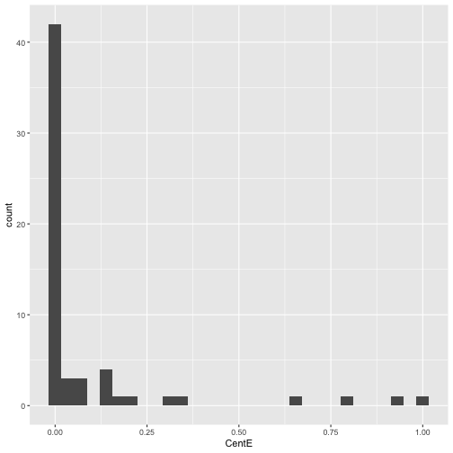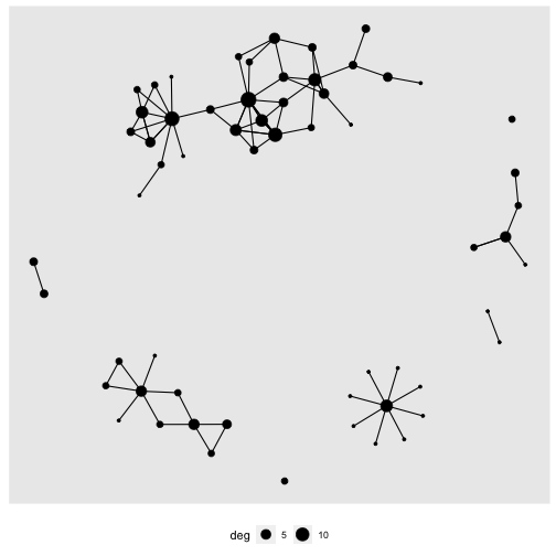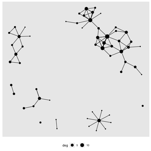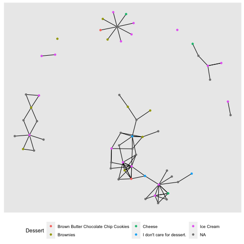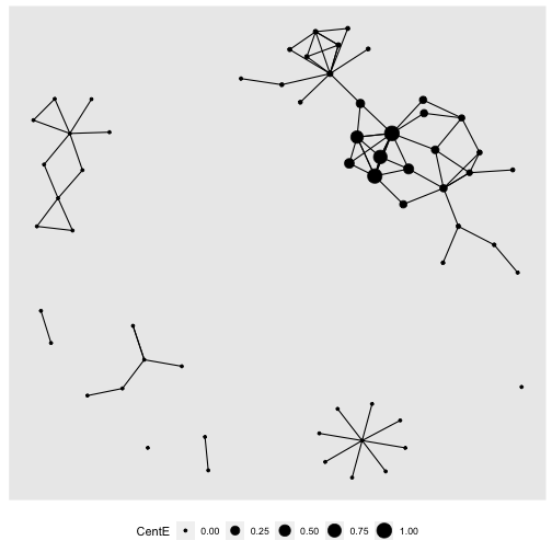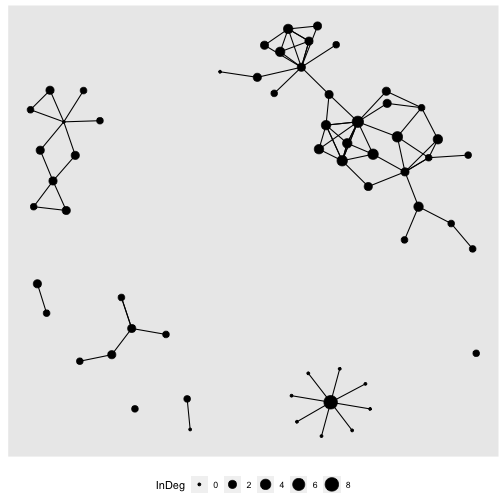 ] .date[ ### 15 June 2023, last update: 2023-06-19 ] --- # Welcome Back! ### Our project is about building and analyzing the Workshop network # Let's load our data This workshop assumes you did the work from day 1 and you know how to install libraries, read csv files into data, and to manipulate data in R. The benefit of having done the work previously is that we don't have to re-do it (unless we want to change something) So I took the network at the end of workshop #1 and saved it as a .rds file. I could have saved it as a pair of csv files and rebuilt the network, but if I save as rds it will be ready to go! To load an rds file the syntax is a little different: ```r gr <- readRDS(here("data", "WokshopNetwork.rds")) ``` --- # Let's inspect our data ```r gr ``` ``` ## # A tbl_graph: 60 nodes and 101 edges ## # ## # A directed multigraph with 8 components ## # ## # A tibble: 60 × 4 ## name AMPM Dessert Pages ## <chr> <chr> <chr> <dbl> ## 1 5106 morning person. Brownies 350 ## 2 6633 morning person. I don't care for dessert. 12 ## 3 7599 night owl. Ice Cream 300 ## 4 4425 morning person. I don't care for dessert. 0 ## 5 2495 morning person. Brownies 264 ## 6 6355 night owl. Ice Cream 4 ## # ℹ 54 more rows ## # ## # A tibble: 101 × 2 ## from to ## <int> <int> ## 1 1 1 ## 2 2 35 ## 3 3 14 ## # ℹ 98 more rows ``` --- # Let's plot it quickly .pull-left[ ## Which node is the most important? ```` ```r gr %>% ggraph(layout = "kk") + geom_edge_link() + geom_node_point(aes(color = Dessert)) + theme(legend.position="bottom") ``` ```` ] .pull-right[ <!-- --> ] --- # Let's explore centrality ### One view of importance is how many people you are connected to. - **Degree** = number of edges a node is involved in. - **In Degree** = number of incoming edges - **Out Degree** = number of outgoing edges Lets calculate degree ```r gr %>% activate(nodes) %>% mutate(deg = centrality_degree(mode = "total")) %>% arrange(desc(deg)) -> gr gr ``` ``` ## # A tbl_graph: 60 nodes and 101 edges ## # ## # A directed multigraph with 8 components ## # ## # A tibble: 60 × 5 ## name AMPM Dessert Pages deg ## <chr> <chr> <chr> <dbl> <dbl> ## 1 7743 morning person. Ice Cream 300 14 ## 2 2921 morning person. Ice Cream 426 12 ## 3 1386 night owl. Ice Cream 500 11 ## 4 7040 morning person. I don't care for dessert. 400 9 ## 5 9929 morning person. Brownies 527 8 ## 6 5051 night owl. Ice Cream 240 8 ## # ℹ 54 more rows ## # ## # A tibble: 101 × 2 ## from to ## <int> <int> ## 1 28 28 ## 2 43 32 ## 3 29 10 ## # ℹ 98 more rows ``` --- # Let's use the degree in a plot .pull-left[ ```` ```r gr %>% ggraph(layout = "kk") + geom_edge_link() + geom_node_point(aes(size = deg )) + theme(legend.position="bottom") ``` ```` ] .pull-right[ <!-- --> ] --- # Let's see about just In-degree ```r gr %>% activate(nodes) %>% mutate(InDeg = centrality_degree(mode = "in")) %>% arrange(desc(InDeg)) -> gr gr ``` ``` ## # A tbl_graph: 60 nodes and 101 edges ## # ## # A directed multigraph with 8 components ## # ## # A tibble: 60 × 6 ## name AMPM Dessert Pages deg InDeg ## <chr> <chr> <chr> <dbl> <dbl> <dbl> ## 1 5844 <NA> <NA> NA 8 8 ## 2 7743 morning person. Ice Cream 300 14 5 ## 3 1386 night owl. Ice Cream 500 11 4 ## 4 2169 <NA> <NA> NA 4 4 ## 5 4755 <NA> <NA> NA 4 4 ## 6 9929 morning person. Brownies 527 8 3 ## # ℹ 54 more rows ## # ## # A tibble: 101 × 2 ## from to ## <int> <int> ## 1 38 38 ## 2 51 20 ## 3 39 15 ## # ℹ 98 more rows ``` --- # Let's use in degree in our plot .pull-left[ ```` ```r gr %>% ggraph(layout = "kk") + geom_edge_link() + geom_node_point(aes(size = InDeg )) + theme(legend.position="bottom") ``` ```` ] .pull-right[ <!-- --> ] --- # Let's compare centrality plots. ### You might have noticed, the plots change layouts .pull-left[ #### To address this we set a layout... ```` ```r GrLayout = create_layout(gr, layout = "kk") ggraph(GrLayout) + geom_edge_link() + geom_node_point(aes(size = InDeg)) + theme(legend.position="bottom") ``` ```` ] .pull-right[ #### The only issue is, we then can't change nodes/attributes. <!-- --> ] --- # Let's compare in-degree and out-degree .pull-left[ ```r ggraph(GrLayout) + geom_edge_link() + geom_node_point(aes(size = InDeg)) + theme(legend.position="bottom") ``` <!-- --> ] .pull-right[ ```r ggraph(GrLayout) + geom_edge_link() + geom_node_point(aes(size = deg)) + theme(legend.position="bottom") ``` <!-- --> ] --- # Let's explore some other centrality measures ### Here is a list of all of the centrality measures that you have access to in tidygraph: ### https://tidygraph.data-imaginist.com/reference/centrality.html ## This is a workshop and thus far I've done most of the work! It is your turn! 1. As a group, choose one of the centrality measures from the list. 2. Calculate the centrality measure, use it in the plotting recipe we've been using, and be ready to describe what you think this centrality metric measures. 3. You will have 10-15 minutes. 4. Be ready to present - talk about what the centrality measure is and the properties that the centrality measure emphasizes. --- # Let's use centrality in hypothesis testing We should establish a research question. How about: ### Are morning people or night owls more central in our network? To test this we might use: 1. An independent samples t-test to see if the means of a centrality metric is different. 2. A linear model to explore the relationships between the grouping variable and the outcome variable. Either way, we need to choose a centrality metric. .center[.font170[Our winner...centrality_eigen!]] --- # Let's first calculate and plot eigenvector centrality Eigenvector centrality is interesting because it allows a node to inherit centrality from neighbors. It works with weighted networks, and but it treats directed networks as undirected. We want to calculate eigenvector centrality, then add it as an attribute to our graph, and add it to our layout dataframe. ```r gr %>% activate(nodes) %>% mutate(CentE = centrality_eigen()) %>% arrange(de